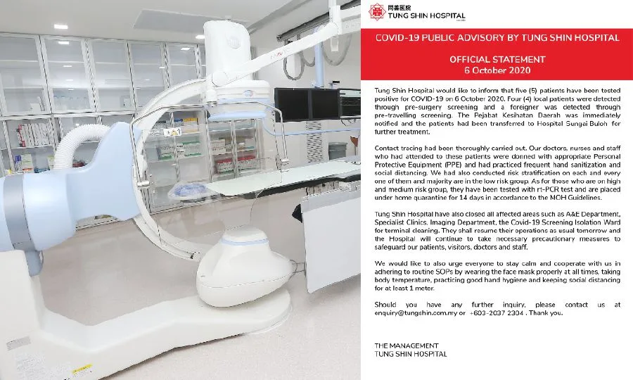 5 patients tested positive yesterday at Tung Shin Hospital, and have since been transferred to the Sungai Buloh Hospital for further treatment. “Risk stratification was also conducted on all medical staff who came into contact with the five positive cases. The majority of the staff are in the low-risk group,” the statement added. Terminal and through cleaning were carried out at affected areas and operations will resume as usual.
