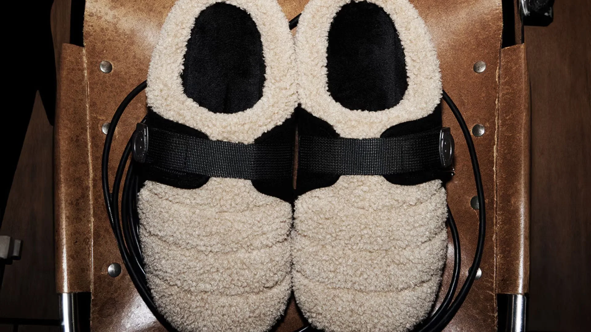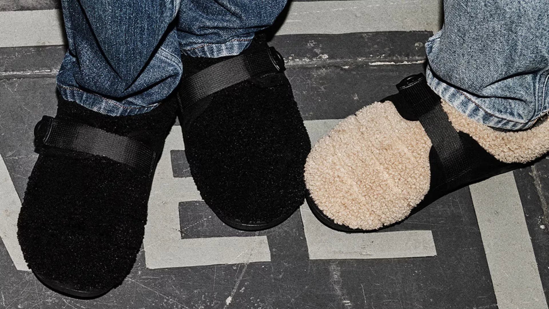 On the other hand, there are the Winter Belt sandals, a more eye-catching slip-on that still retains its toe-warming capabilities. Available in black and beige, these slippers feature faux wool uppers with a plush sherpa-like texture. They also feature a hefty black velcro strap for a snug fit.