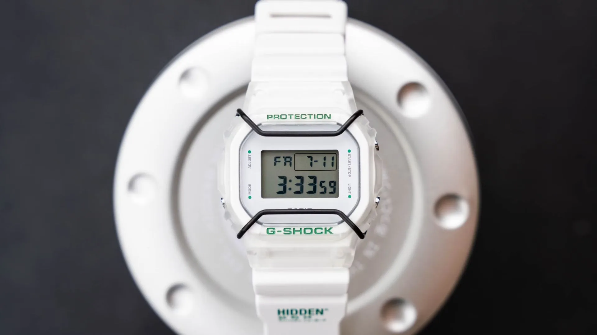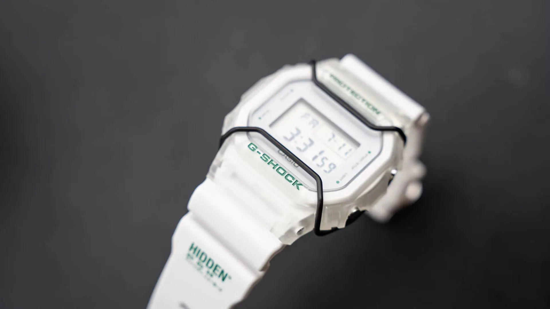 Hidden’s first G-SHOCK in 2023 had a transparent off-white design that divided opinions. The new DW5600HDN257 swaps that for a sleeker white and green colourway, keeping the rare bull bars for extra durability and style.