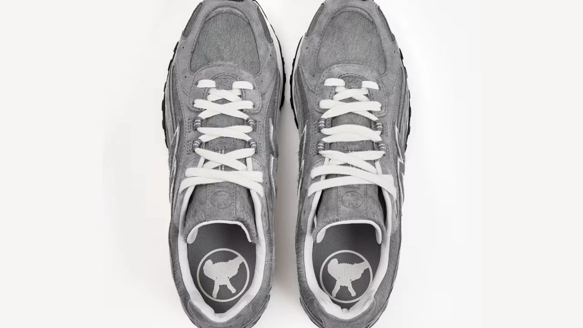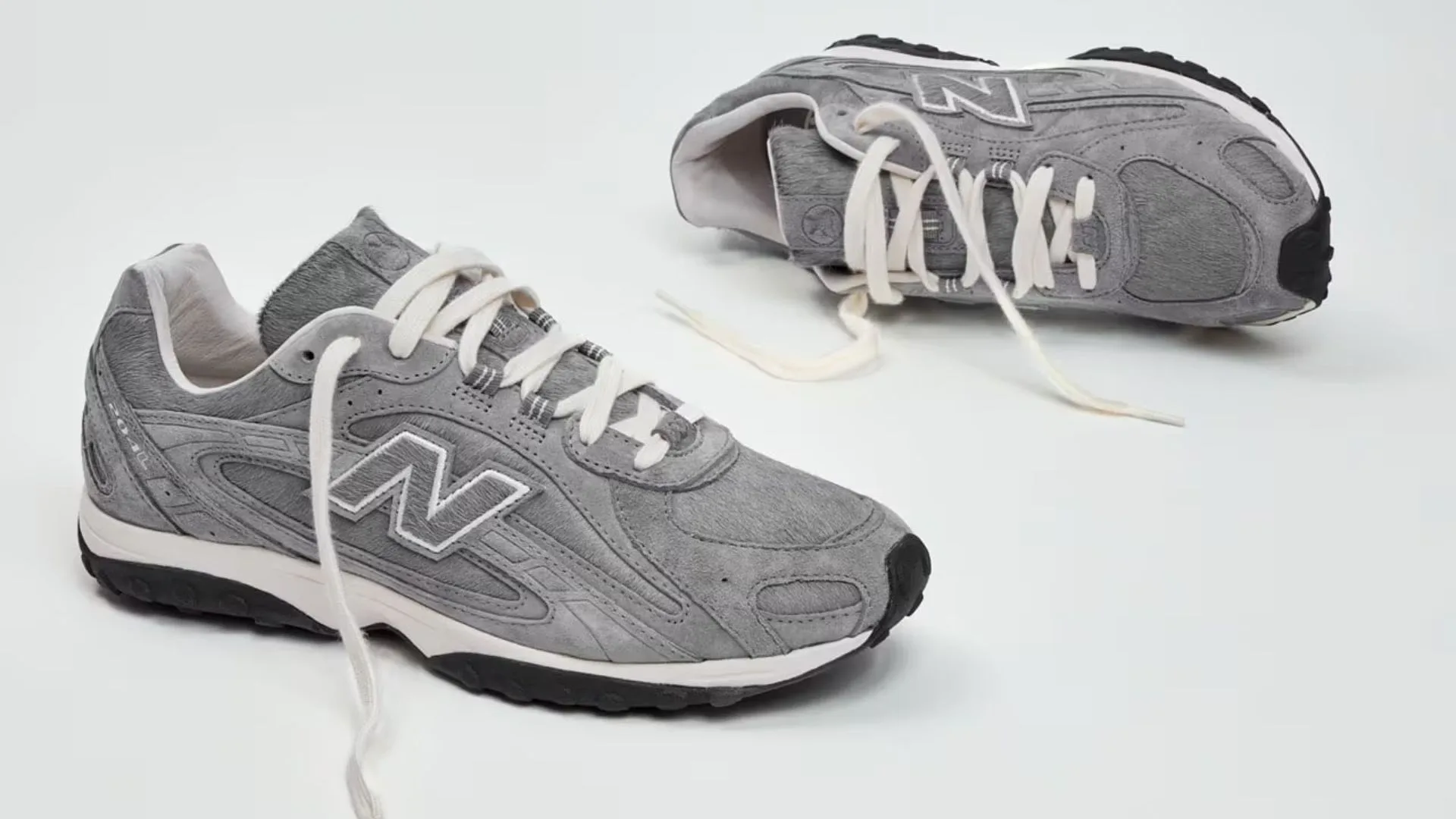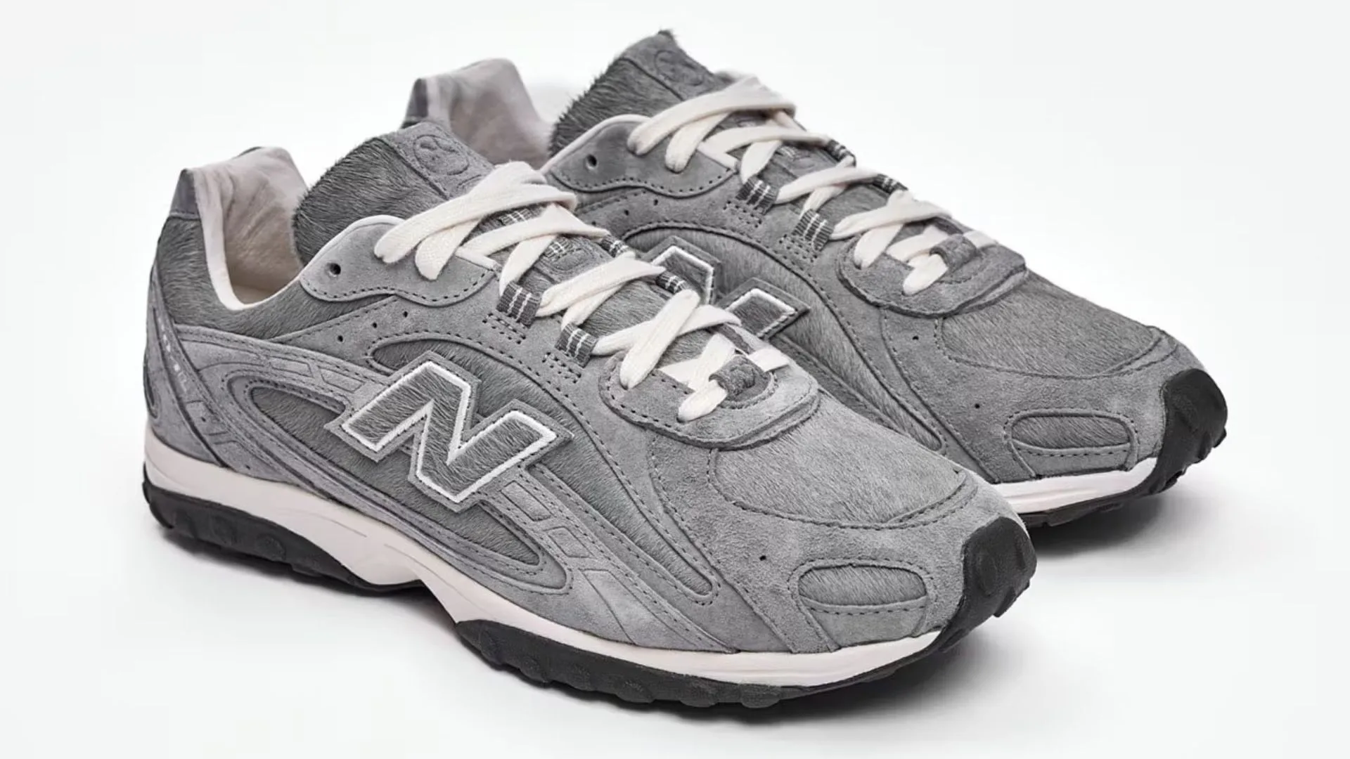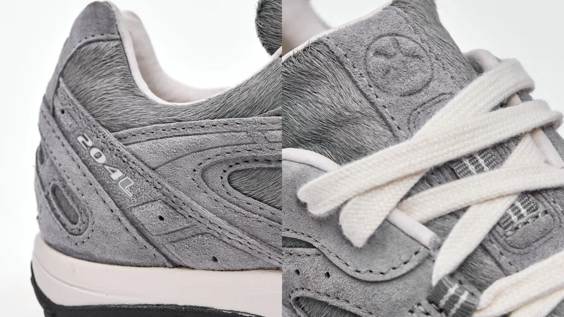 Textured pony hair underlays accentuate the collaborative version of the new NB silhouette, which is covered in a variety of grey hues.