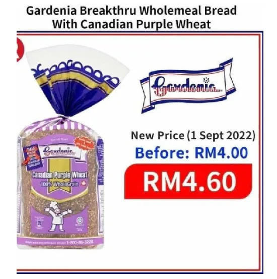 Let’s not forget the Gardenia Breakthru Wholemeal Bread with Canadian Purple Wheat. This intriguing and tasty loaf has gone up from RM4.00 to RM4.60 thanks to a 60 sen increase.