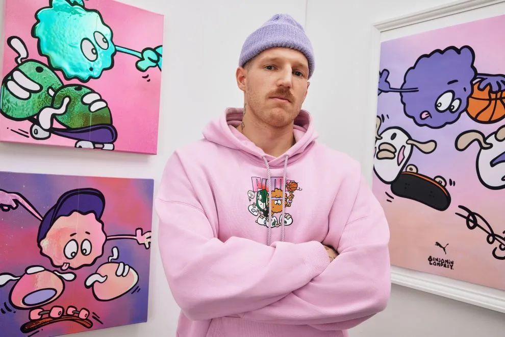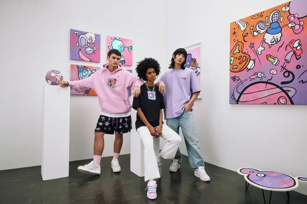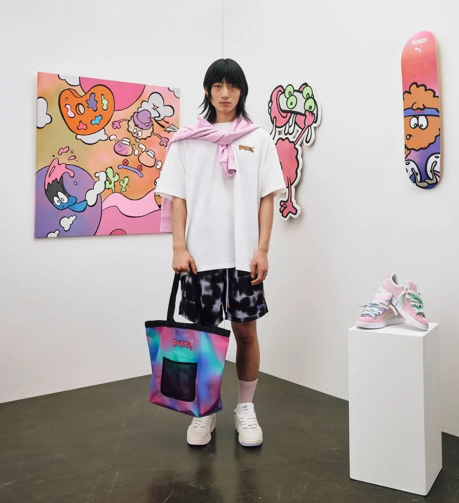 An artist and designer, as well as an in–house member of the PUMA design team, 8enjamin’s work is an expression of colour, action, and positivity. Defined by relaxed fits, psychedelic prints, and skate–inspired details, the collection features apparel including graphic–adorned hoodies and T–shirts bearing the image of Fluzz. 8enjamin has also created a bubbly rendition of the PUMA wordmark, which is used on select pieces throughout.