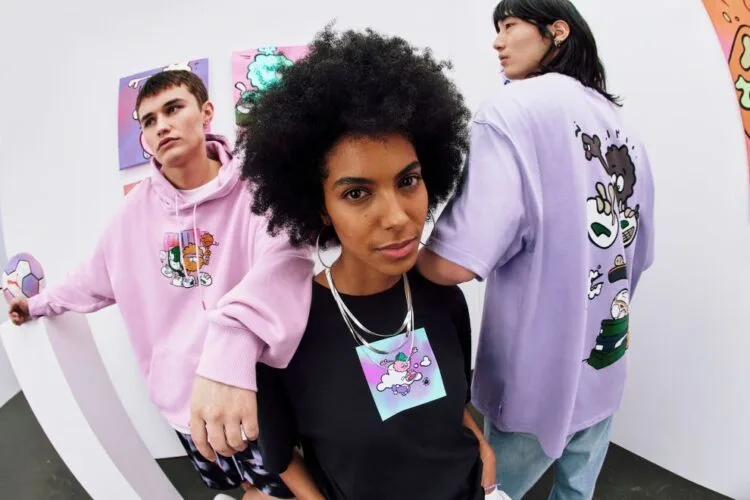 For footwear, 8enjamin’s Fluzz character informs the Suede and Slipstream sneakers. An homage to some of the artist’s favourite sneakers, and models he has loved wearing himself, the Suede is reimagined with a light pink upper, overstated fluffy laces, and a custom Fluzz hangtag. The Slipstream features a tonal white colourway with pops of purple and pink throughout, also featuring fluffy laces. Both shoes come packaged in a special shoe box that doubles as a collectible art piece.