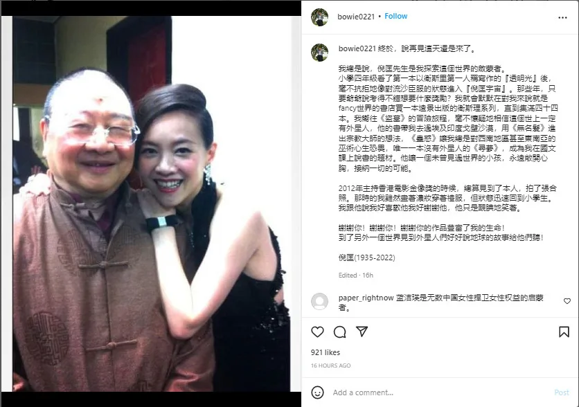 Singer Bowie Tsang too shared her memories of Ni Kuang. Apparently, she had been an avid reader of his books and treasured the insights he shared with readers. Bowie was also fortunate enough to meet him once during the Hong Kong Film Awards 2012. “Although I was wearing heavy makeup and a dress at that time, (it) was like I had returned to primary school,” she said.