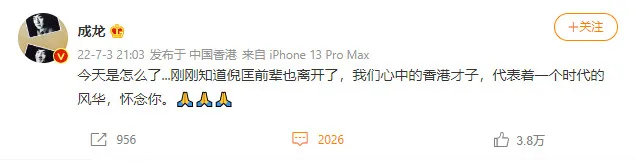 His passing marks the end of an era, both in the screenwriting field and among novelist fans. Friends, peers and co-workers alike have come forward to wish the venerated author goodbye, including names like Jackie Chan (成龍), Andy Lau (劉德華) and Bowie Tsang (曾寶儀).