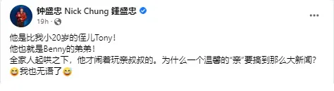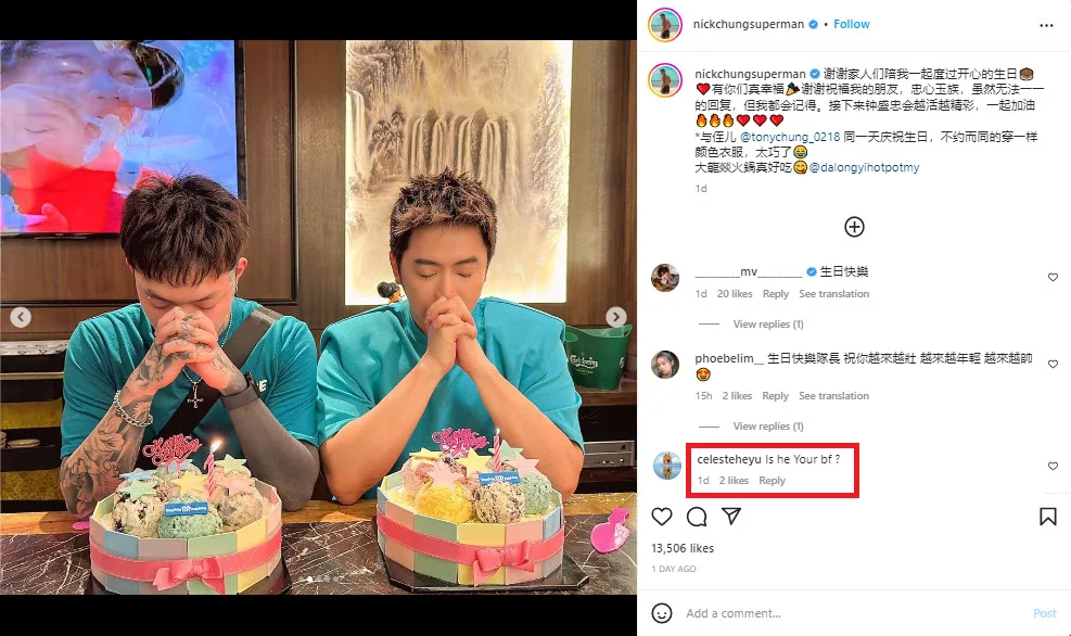 Nick was equally quick to post an explanation. “Celebrated my birthday on the same day as my nephew, Tony, who coincidently wore the same coloured clothes (as me),” he wrote. When some netizens persisted in questioning their relationship, Nick put his foot down. “He is my nephew Tony who is 20 years younger than me! He is also Benny (Nick’s other nephew)’s younger brother!” Nick stated, adding Tony had merely been playing around.