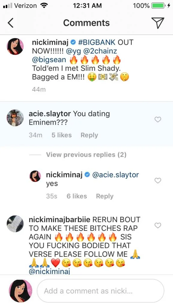 It all began with a curious comment from a fan, who asked, “You dating Eminem???” Minaj replied with a short and concise”yes”. This immediately sent fans into frenzy. Hours later, the 45-year-old rapper replied to the same comment with, “Girl you know it’s true…”