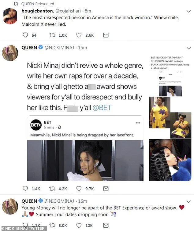 Minaj’s response? She declared that she was no longer performing at the BET Experience concert in June (where she was supposed to co-headline the concerts with Cardi B). In addition, she also wrote, “Young Money will no longer be a part of the BET Experience or award show.”
