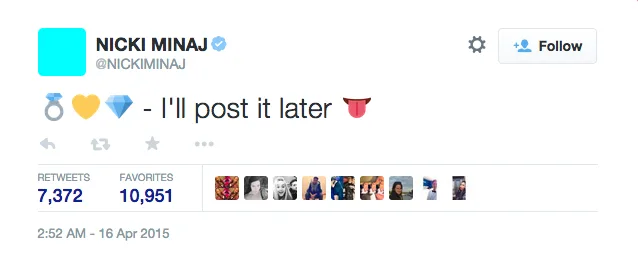 Superstar Nicki Minaj is sparking engagement rumours on social media as she teased fans by sharing a tweet captioned with a string of emojis along with the message, “I’ll post it later”.