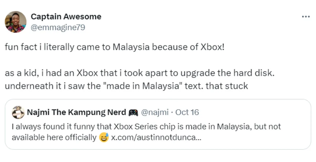 Emmanuel Chukwuemeka Olalere, also known as Geekception, is a Nigerian YouTuber based in Kuala Lumpur. In response to an online discussion about the Xbox central processing unit (CPU), he shared how the gaming console inspired him to pursue his studies in Malaysia. Emmanuel revealed, “As a kid, I had an Xbox that I took apart to upgrade the hard disk. Underneath it, I saw the “Made In Malaysia” text. That stuck”.