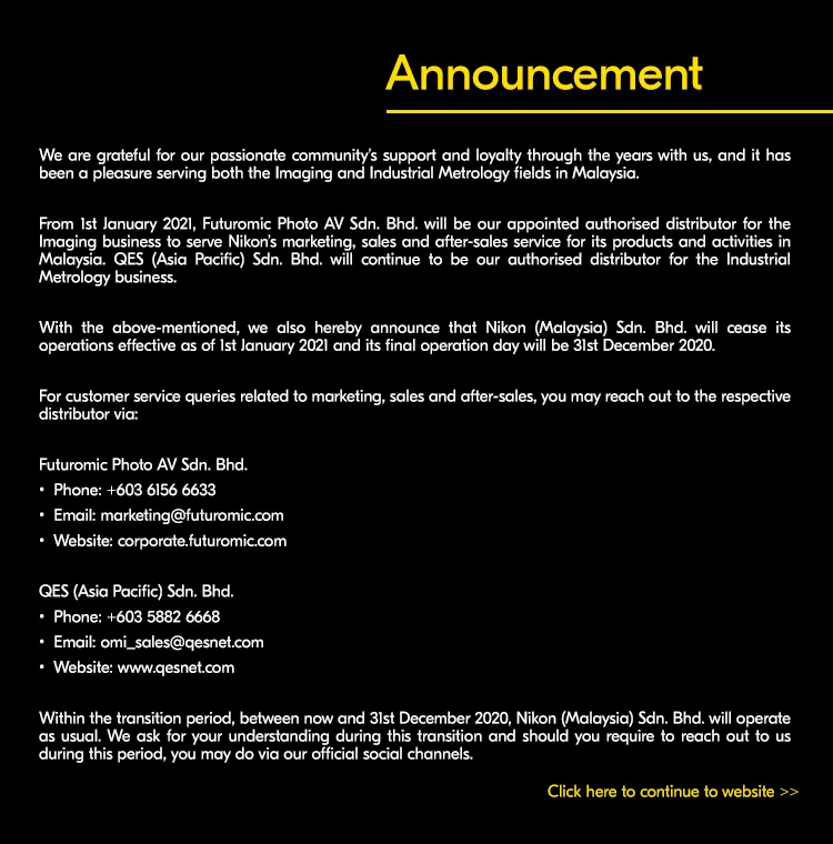From 1st January 2021, Futuromic Photo AV Sdn. Bhd. will be our appointed authorised distributor for the Imaging business to serve Nikon’s marketing, sales and after-sales service for its products and activities in Malaysia. QES (Asia Pacific) Sdn. Bhd. will continue to be our authorised distributor for the Industrial Metrology business.