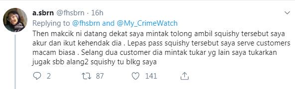 It’s believed that the incident started when the girl was serving another customer at the counter. Many customers and nearby passers said that the female customer asked the girl to take the squishy doll hanging behind the counter.