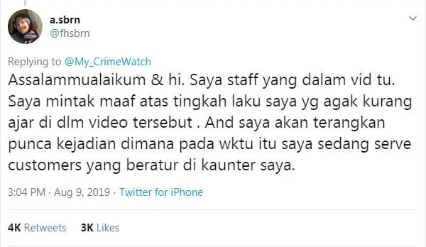 The 1-minute video caught the attention of netizens who defended the girl for standing up for her rights against the female customer. On the other hand, some also criticised her for being rude towards the woman. As of today (14th August 2019), the video has received over 1.2 million views on Twitter.