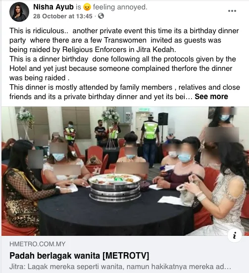 In recent news, a birthday party hosted at a hotel in Kedah was raided by religious authorities which found a total of 30 transwomen in their 20s and 40s.