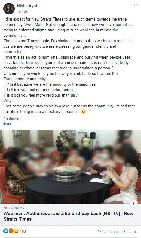 Malaysian transgender activis, Nisha Ayub, took out her frustrations on her Facebook page after a well-known local media portal used the term “Woe-man” in its headline, when referring to transwomen. She stated in the post, “Woe-Man? Not enough (with) the raid itself now we have journalists trying to enforce stigma by using such words to humiliate the trans community.”