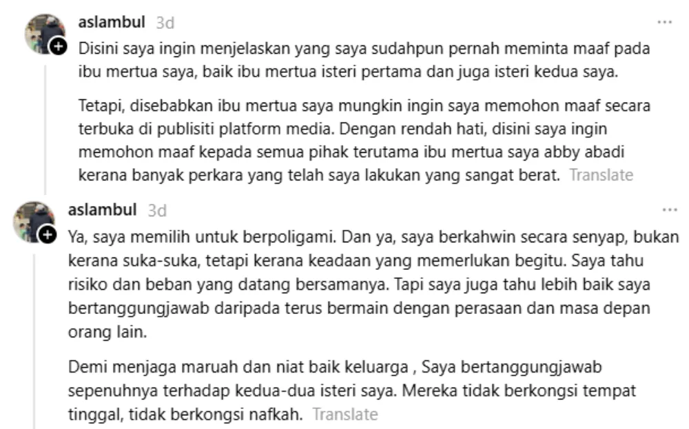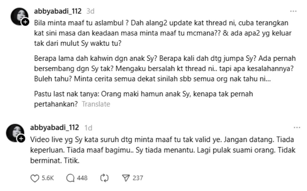 The tension between families grows as netizens have also commented how Abby Abadi should apologise to Ahmad Aslam’s wife, local influencer Umaisya Mazlan. No statements have been released by her on the situation.