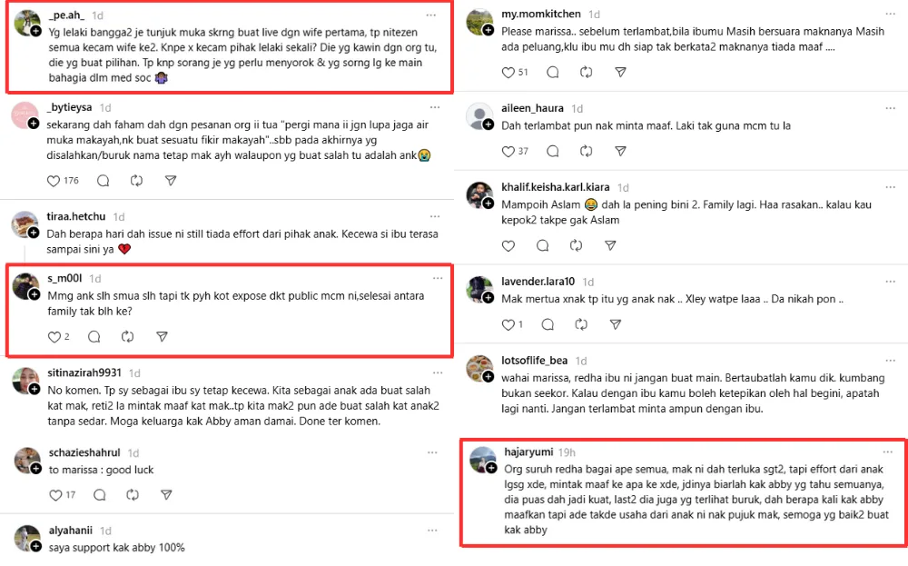 Netizens gave mixed reactions towards the statement, with some questioning where the blame was shifted to. User @/_pe.ah_ comments, “He proudly shows his face on live with his first wife, but netizens condemn the first wife. Why not condemn the guy’s side as well?”. Some netizens also comment on the method of exposing the family feud online, with user @/s_m00l commenting, “It’s true that the children are at fault, but you didn’t have to expose this to the public. This should be settled between families”.