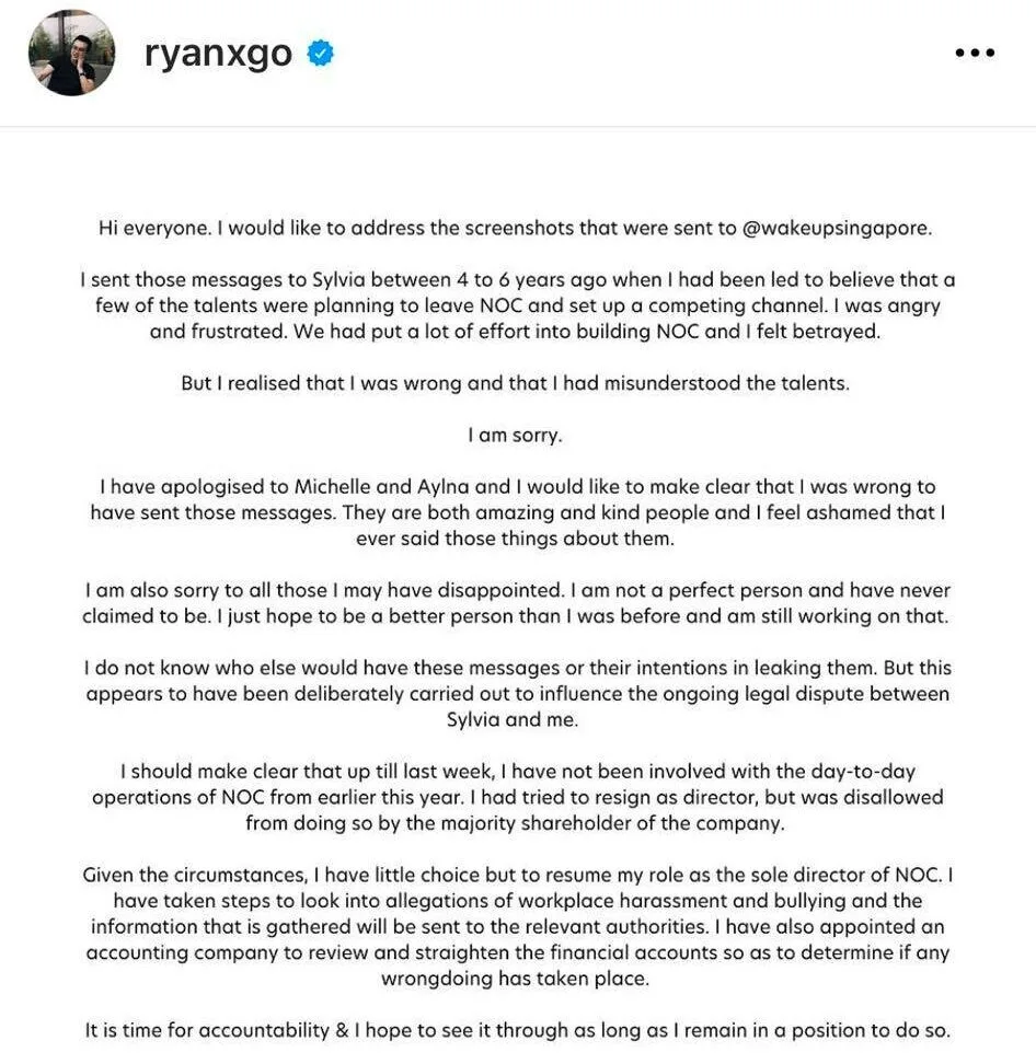 According to the 33-year-old Singaporean, he has personally reached out to the duo in question to apologise. “They are both amazing and kind people and I feel ashamed that I ever said those things about them,” Ryan wrote. “I am also sorry to those I may have disappointed. I am not a perfect person and have never claimed to be.”