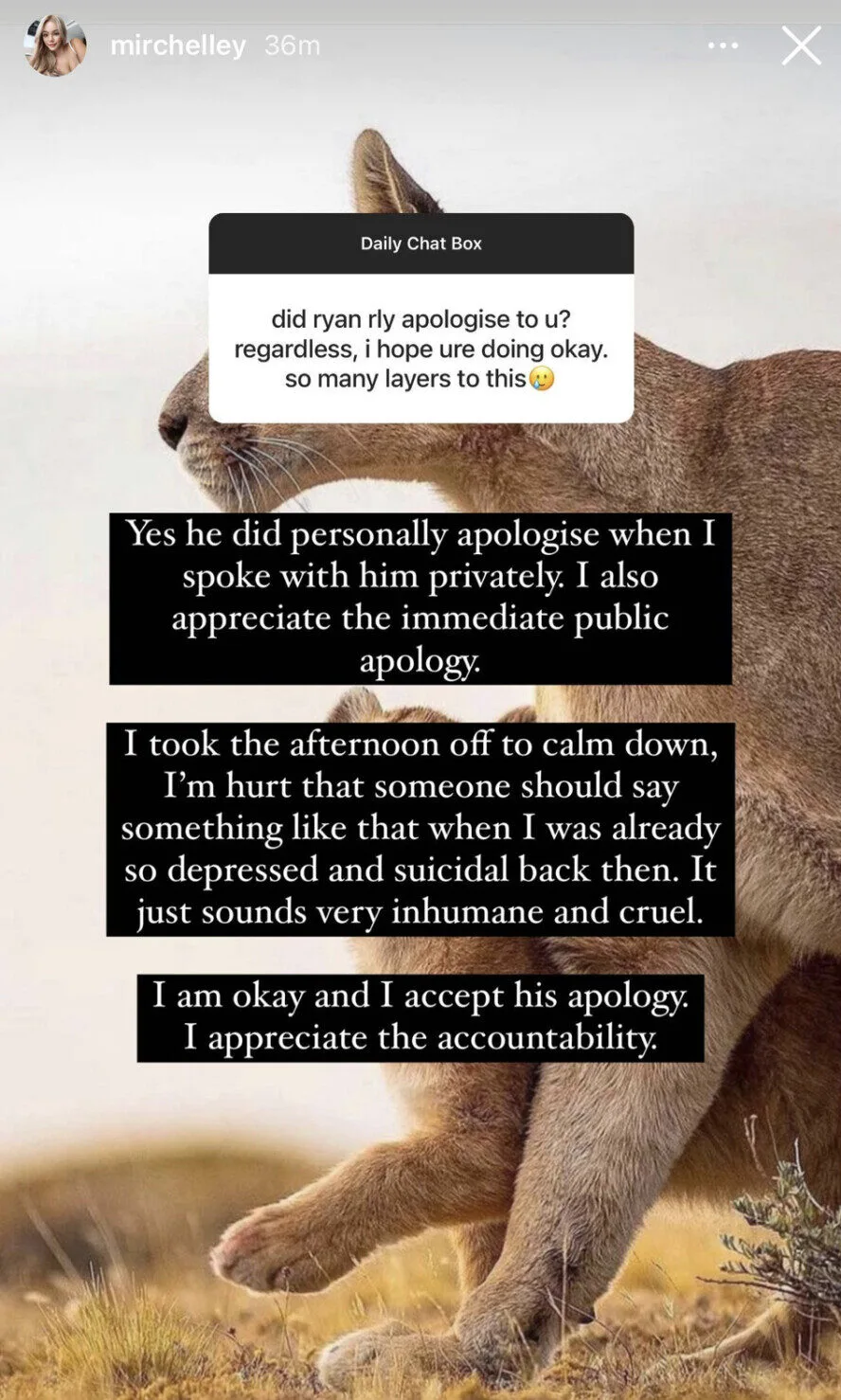 Not long after the leaked Whatsapp texts were made public, Ryan took to his Instagram to issue his statement. In his apology, he explained that the conversation had taken place sometime between 4-6 years ago. Out of anger and frustration, he vented to then-wife after feeling betrayed.