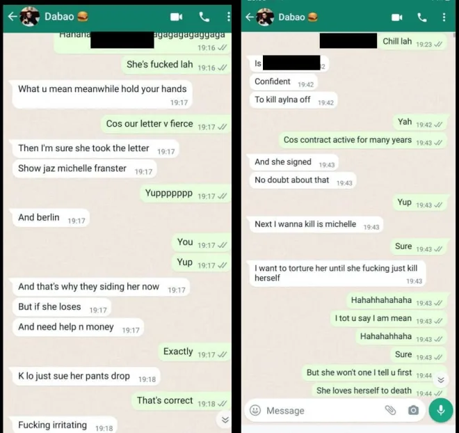 In the texts, Dabao (which is ex-wife Sylvia Chan’s nickname for Ryan) expressed his wish that former NOC employees Michelle and Aylna Neo would just go “kill themselves” after mistakenly assuming that the ladies were joining a competing channel.