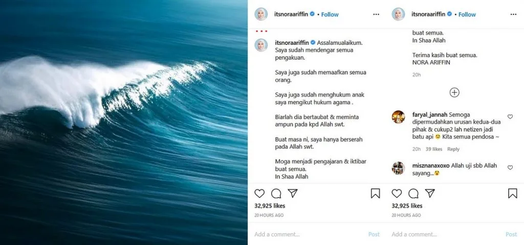 The “Samudera” songstress wrote, “Assalamualaikum. I’ve heard all the confessions and I’ve forgiven everyone. I’ve also punished my daughter in accordance to the Islamic law. Let her reflect on her mistake and ask for forgiveness from God. For now, I’ll leave it all to Him. Hopefully this issue can be taken as a lesson for all. Thank you.”