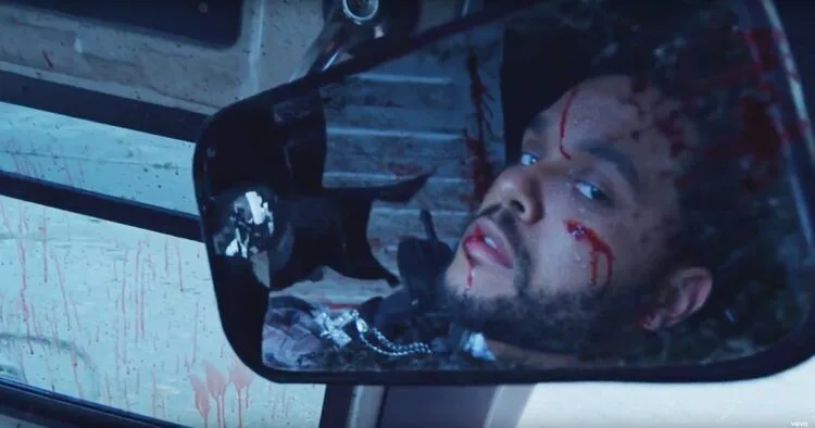 Luckily, the woman saves The Weeknd by shooting the accomplice. Unfortunately, the van crashes and the last remaining robber finds himself with a shard of glass through his stomach. After the kidnapped woman escapes with the stolen money, the camera pans to a mirror showing the performer looking at himself. We also see him wearing the same cross necklace that made its debut in the “Starboy” video.