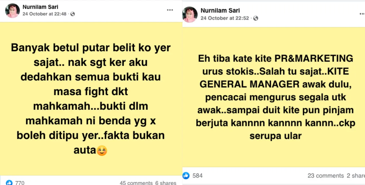 She added, “All of a sudden, she said that I used to do PR and marketing jobs and was in charge of managing the stockists. You’re wrong, Sajat. I was the general manager. I was the one who took care of everything for you. You even borrowed millions of ringgits from me, remember? You’re nothing but a snake.”