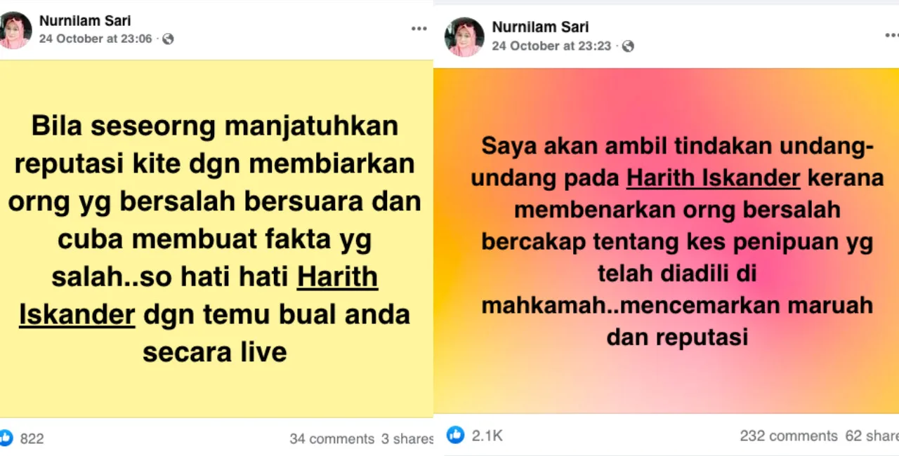 At the same time, Nurnilam Sari, along with another individual involved in the fraud case involving the “Makhluk Penggoda” songstress, known as Nurwati Husin, is similarly planning to sue the “Talentime” actor over his biased opinion during the interview. She revealed, “I will take legal action against Harith for allowing the person to talk about a fraud case that had been judged in court, tarnishing our dignity and reputation.