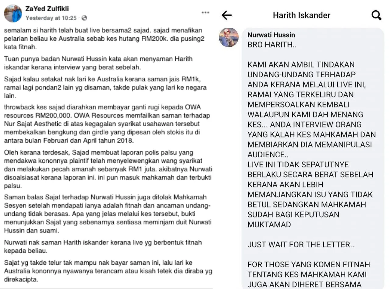 Harith has yet to respond to the allegations left by Nurnilam Sari on her Facebook account.