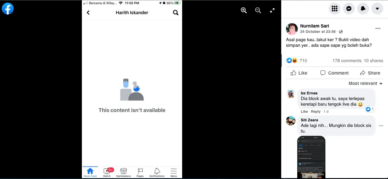 In a more recent update on her FB page, however, a few commentators pointed out that Harith might have apparently blocked Nurnilam Sari on his social media! She commented, “What’s wrong with your page? Are you intimidated? I’ve already kept the video evidence. Is there anyone who is facing the same situation as me (unable to access Harith’s account)?”