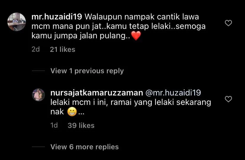 Speaking of Sajat, the trans personality recently wowed her followers with a photo of herself donning a pink-coloured slit dress on her Instagram. Although many fans were loving her on-point look, Sajat still couldn’t avoid herself from facing the wrath of a few bitter nitpickers. IG user, @mr.zuhaidi19, in particular, even decided to call Sajat out and “advised” her to return to the right path.