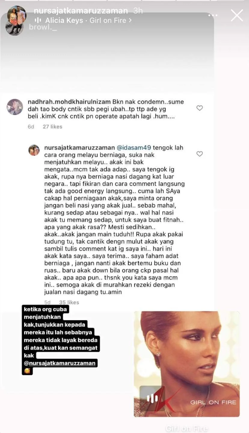 The 36-year-old businesswoman then concluded her remark by thanking the netizen for her sincere comment. “I wish you all the luck and success with your ‘nasi dagang’ business,” Sajat wrote. Not only that, she even accompanied her IG Story post with Alicia Keys’ empowering song “Girl On Fire” playing in the background.
