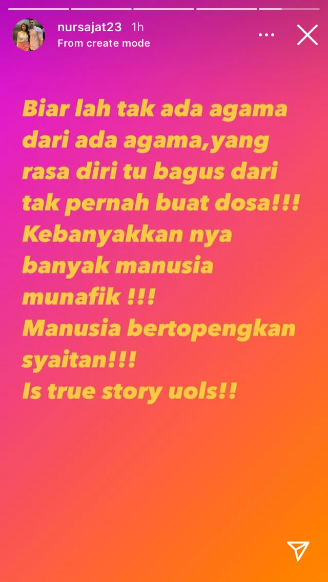 Last evening (Wednesday, 14th April), Sajat responded to the internet trolls who have been criticising her religious faith. “Some people feel like they’re more superior, as if they have not sinned. Most of them are ‘munafik’ (hypocrites)!! They are the devils in disguise. It’s a true story y’all!!” she wrote on the post.