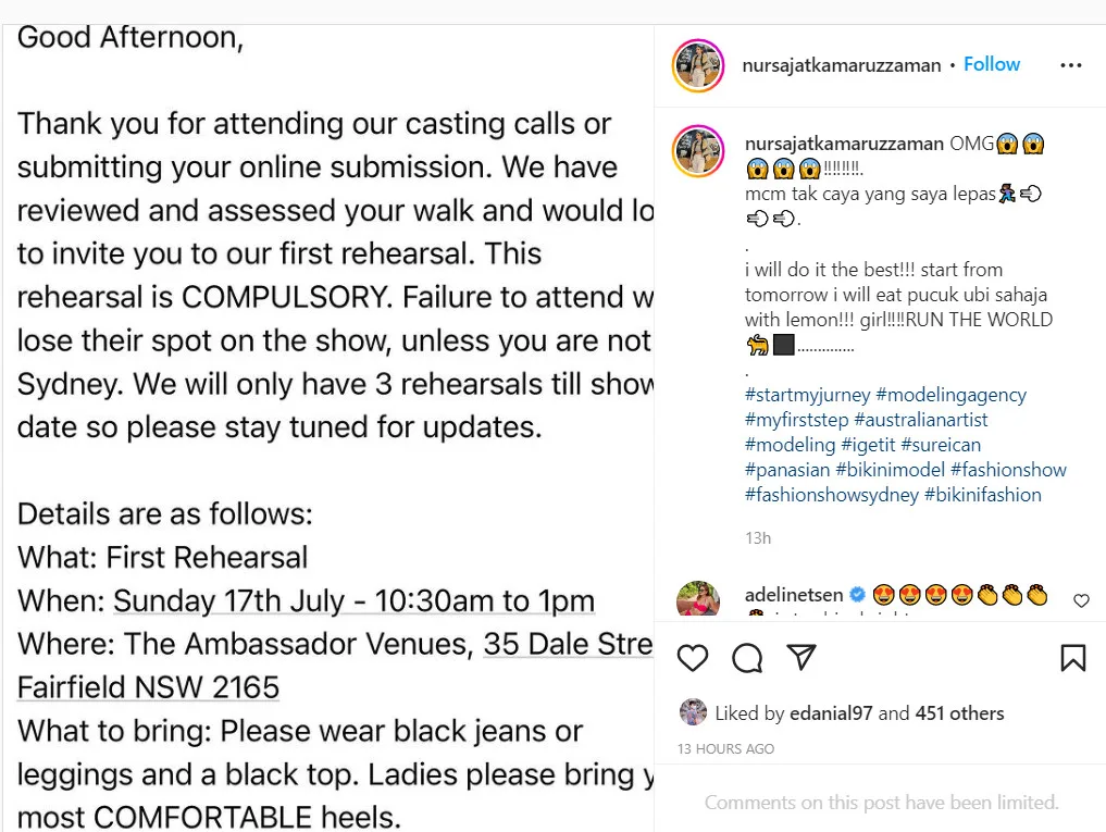 As seen in the statement uploaded by Sajat on her Instagram, the Sydney-based modelling agency had invited her to attend their first rehearsal, after reviewing and assessing her runway walk. “We will only have three rehearsals till the show’s date, so please stay tuned for updates,” the post reads. It’s understood that the first rehearsal will be held this Sunday (17th July) at The Ambassadors Venue in Fairfield, Australia.