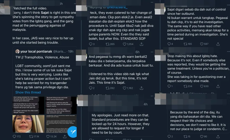 “The officer had warned her several times that they will use force on her if she didn’t cooperate, as they have the right to do so. I listened to this video because I wanted to see what JAIS did wrong. But this time, JAIS is not at fault, but Sajat was in the wrong,” Azeera added in another thread.