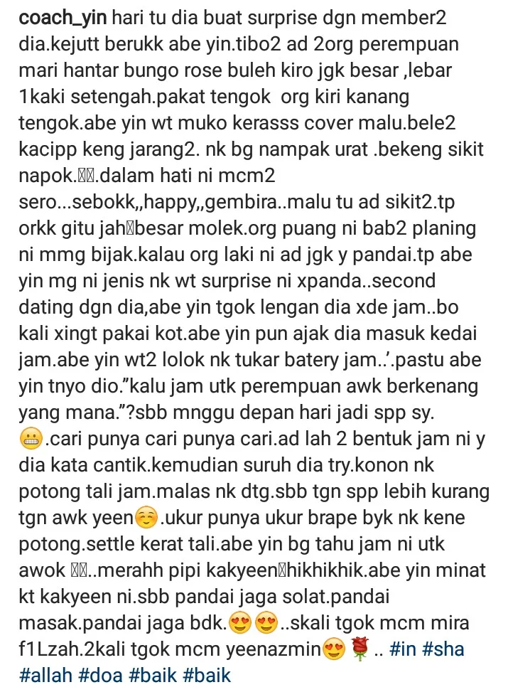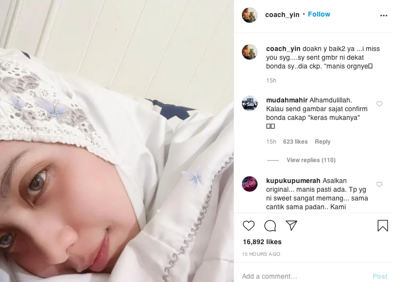 So what made Coach Yin fall for the lucky lady? “I’m interested in her because she rarely misses her prayer times. She’s also very skilled in cooking as well as taking care of children. At first glance, she resembles Mira Filzah. But after looking at her twice, she looks like Yeen Azmeen,” he wrote on the caption.