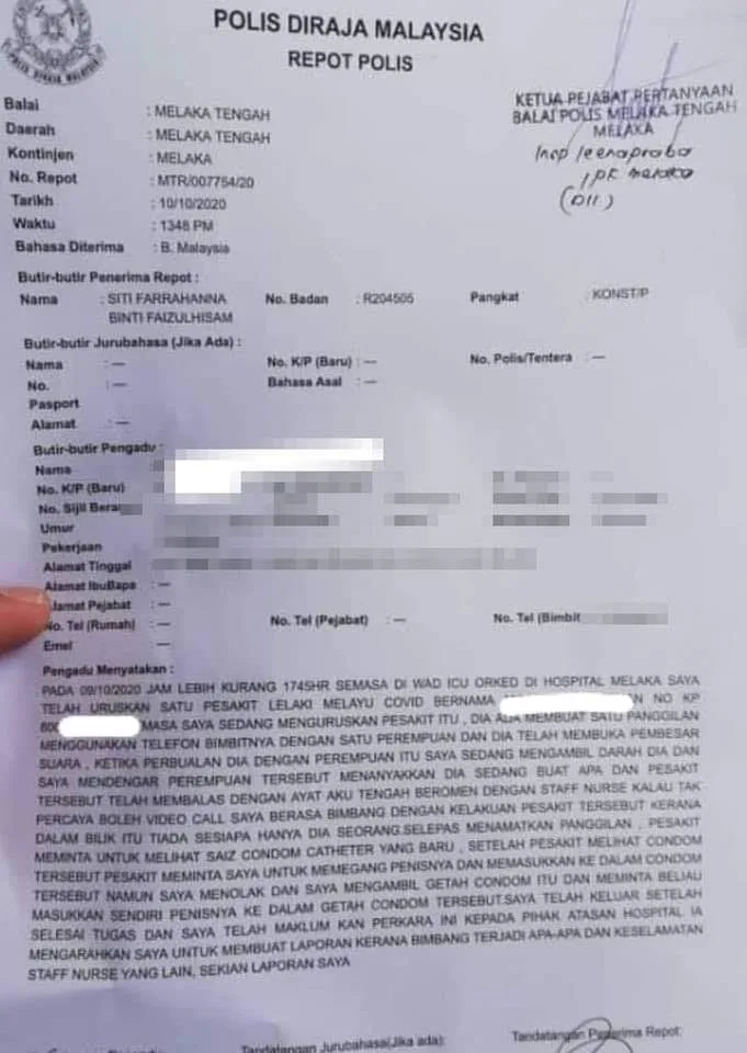 A nurse at Hospital Melaka lodged a police report, claiming to be a victim of sexual harassment by an elderly man who is a Covid-19 patient there.