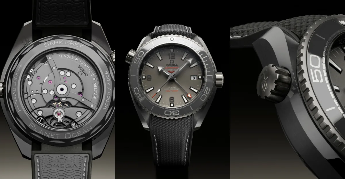 OMEGA continues its legacy of groundbreaking technology with the introduction of the Seamaster Planet Ocean Dark Grey. What makes this timepiece truly special is the extensive use of silicon nitride ceramic, a first for OMEGA in such a large-scale application in watchmaking. The result is an adventure-ready watch that combines toughness with remarkable lightness. The silicon nitride ceramic’s featherweight quality ensures a comfortable wearing experience, while its robust nature guarantees strength for serious exploration. The 45.5 mm casebody, patented NAIAD LOCK caseback, and bezel ring are all crafted from this dark grey material. Complementing this, Grade 5 titanium, a favourite in the aerospace industry, is used for the bezel body and strap folding clasp, along with the sand-blasted dial featuring anthracite hands and indexes. This choice of materials enhances the watch’s durability without adding excessive weight.