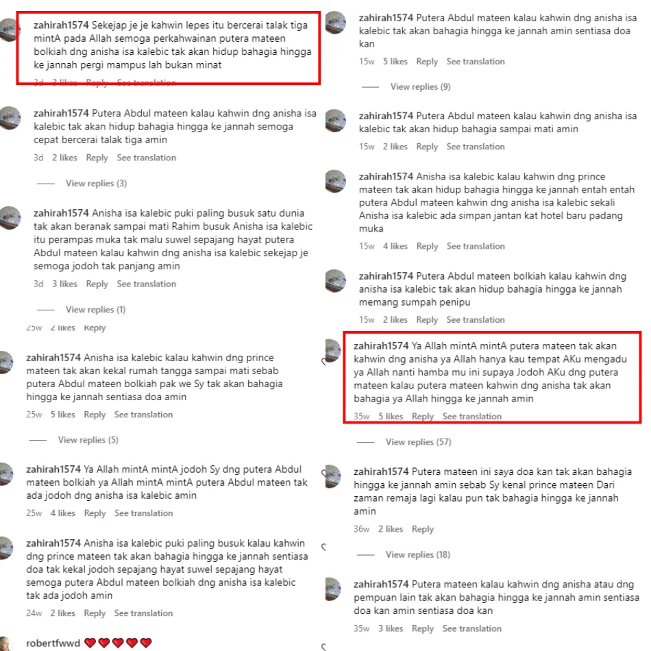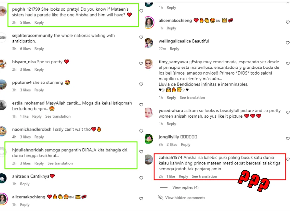 While most fans showed nothing but love and support for Anisha for her big day this weekend, there was one individual who posted a very nasty comment (screenshot above), hoping for Prince Mateen and Anisha to break up. Not necessarily surprising cause this particular person has left many negative comments about His Royal Highness’s fiance for a very long time now as seen in the screenshots below.