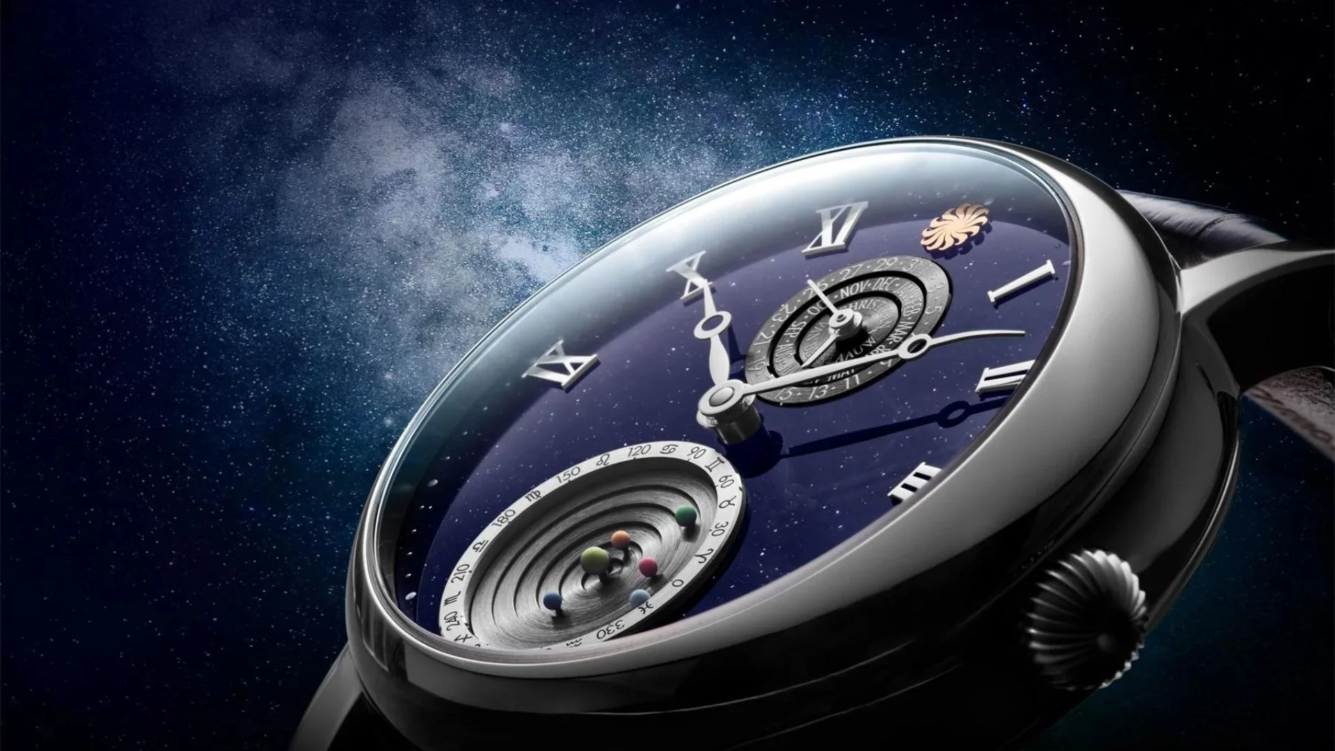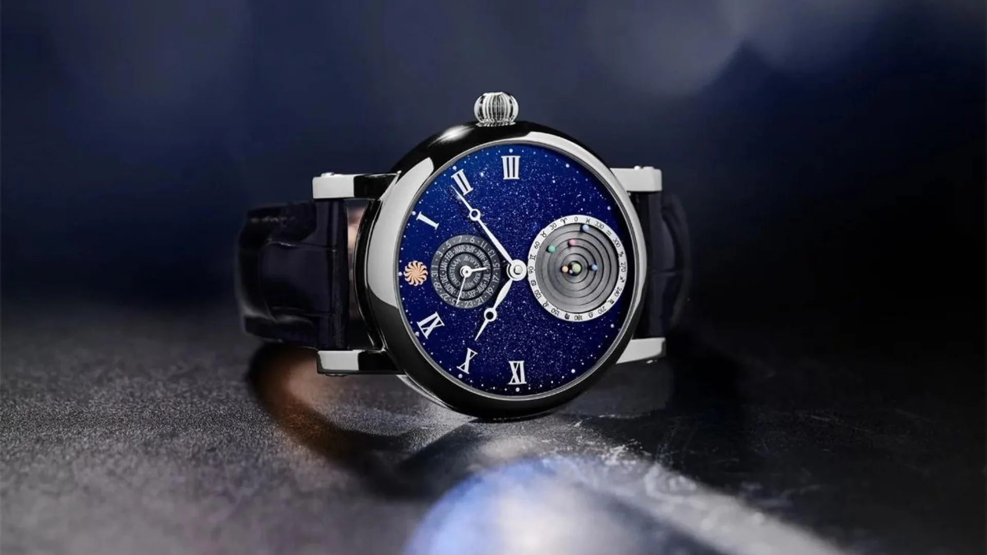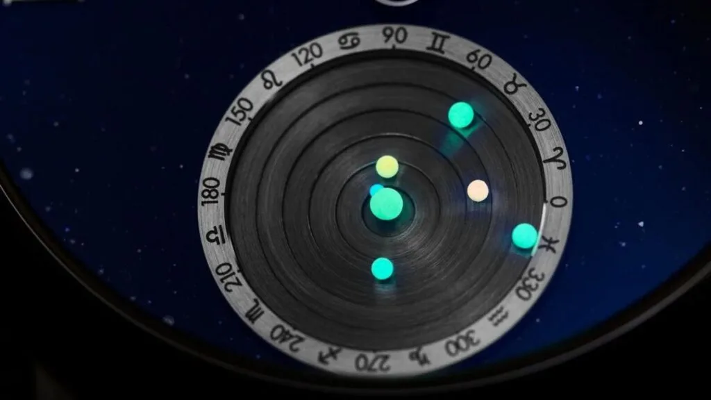The starry Aventurine dial of the Planetarium Prometheus presents a celestial spectacle with our solar system incorporated as a horological complication. What the device’s creators describe as the smallest mechanical planetarium is perched on the lower sector of the watch face; this feature also brought CVDK the GPHG Calendar and Astronomy Watch Prize back in 2021.