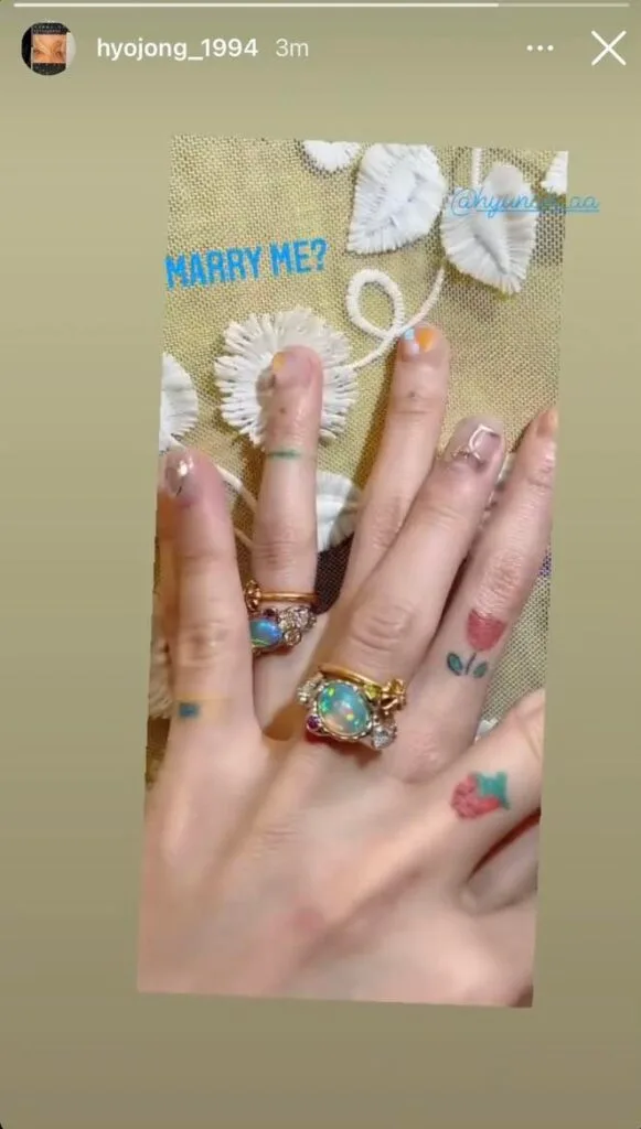 The latter took to his Instagram Story yesterday (Thursday, 3rd February) to share a video of his and HyunA’s hands coming together with matching rings on their ring fingers. He tagged HyunA and wrote, “Marry me?”