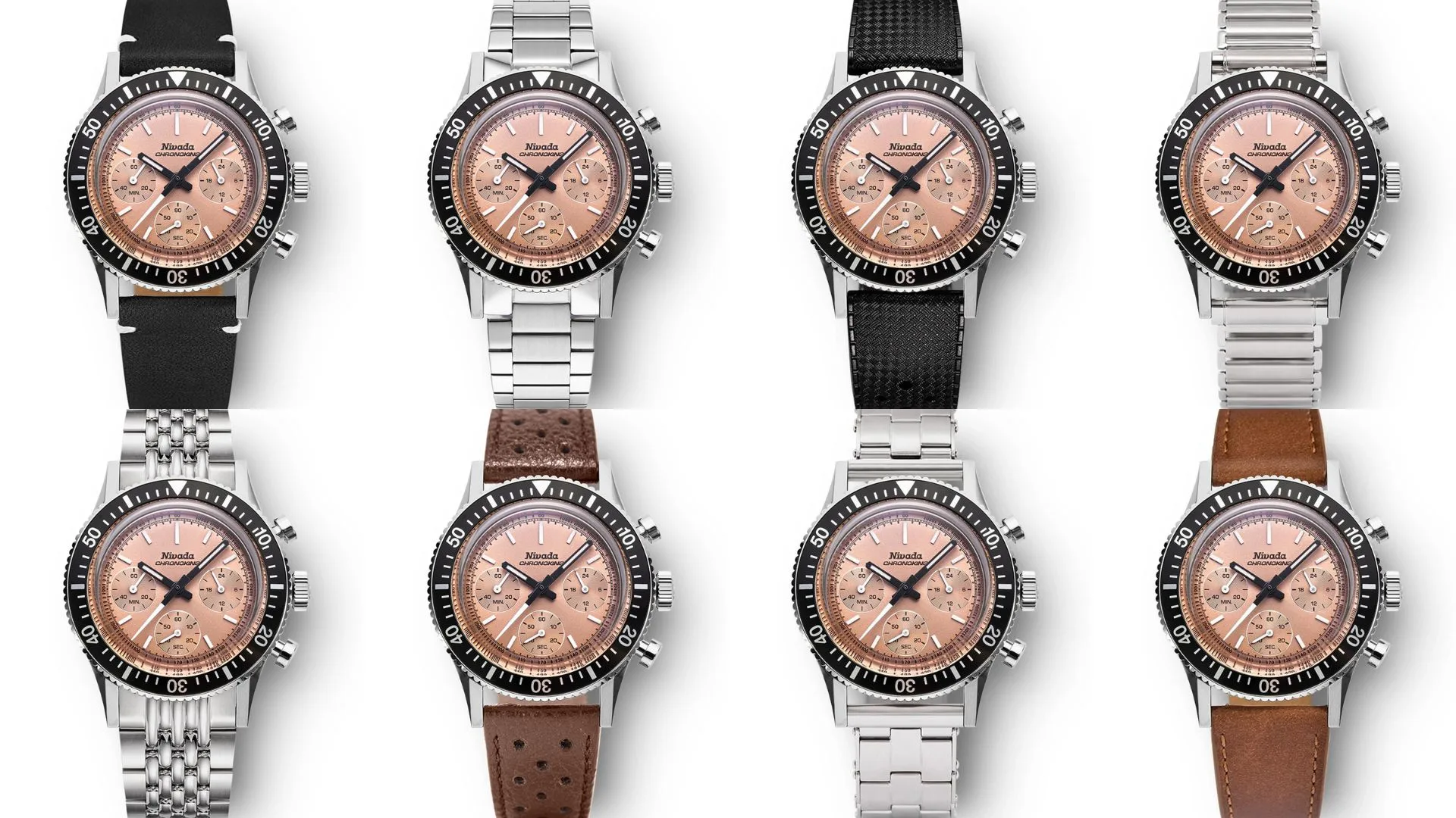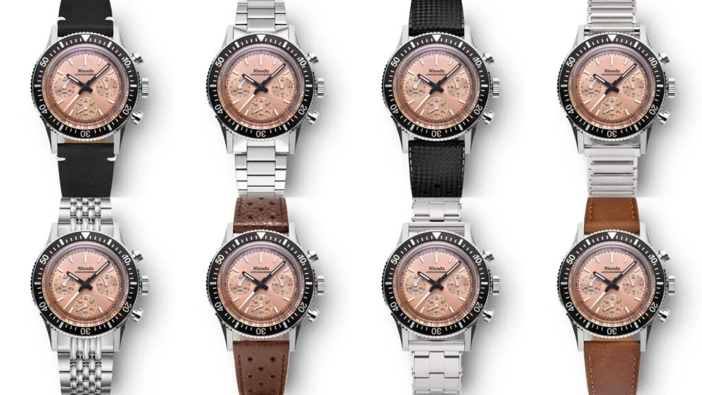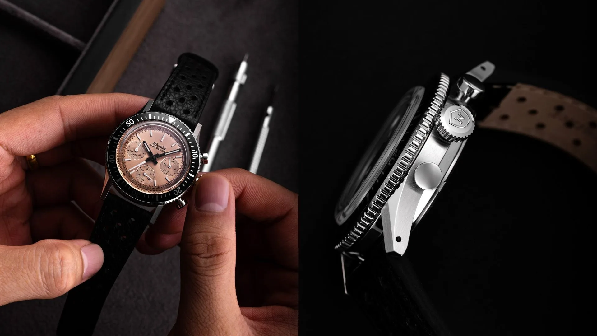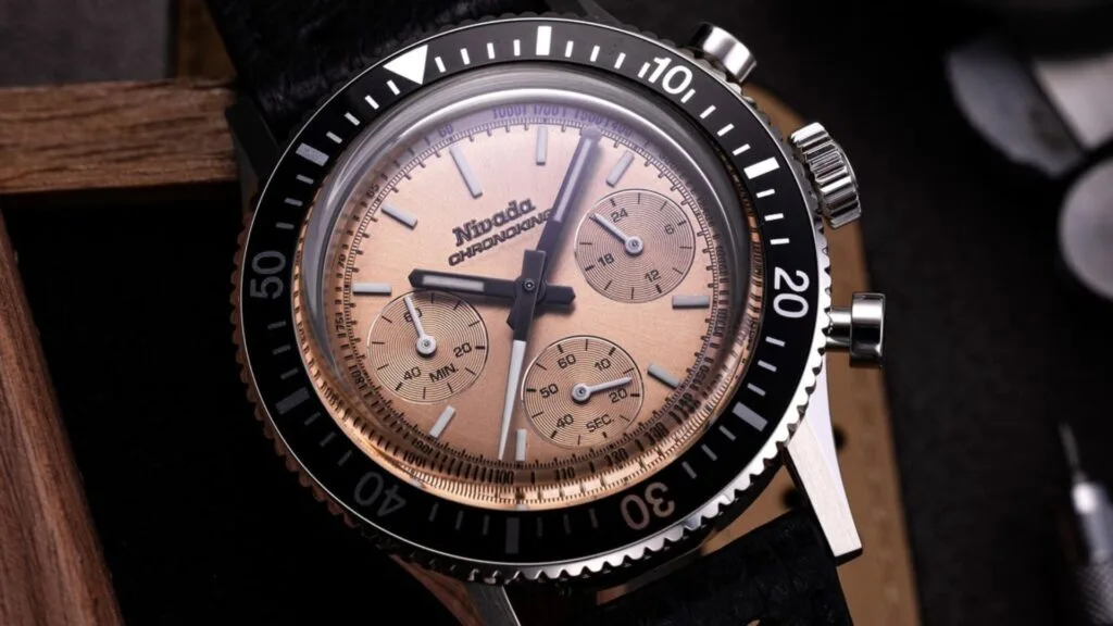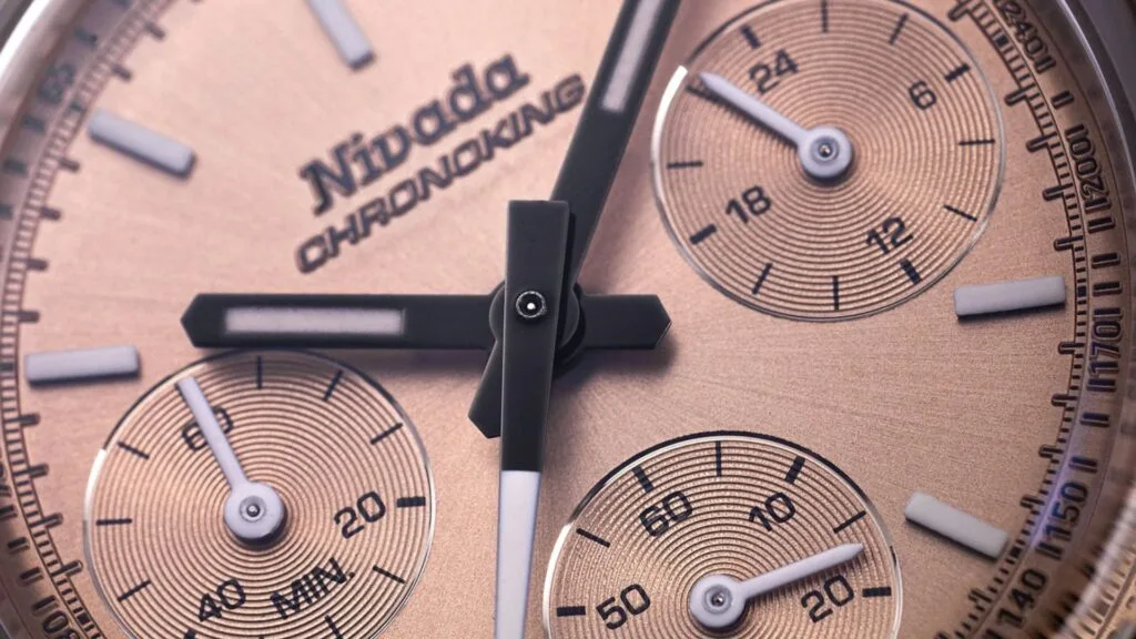 Delving deeper into the design philosophy of the dial: The tan sub-dials, which feature “Newman” typography, light up the salmon dial. Combining this with the minute track’s white gradient creates an unusual sense of depth. Underneath that is the TMI VK63A mecaquartz movement, a tried-and-tested creation from Nivada Grenchen that will always deliver precision timekeeping.