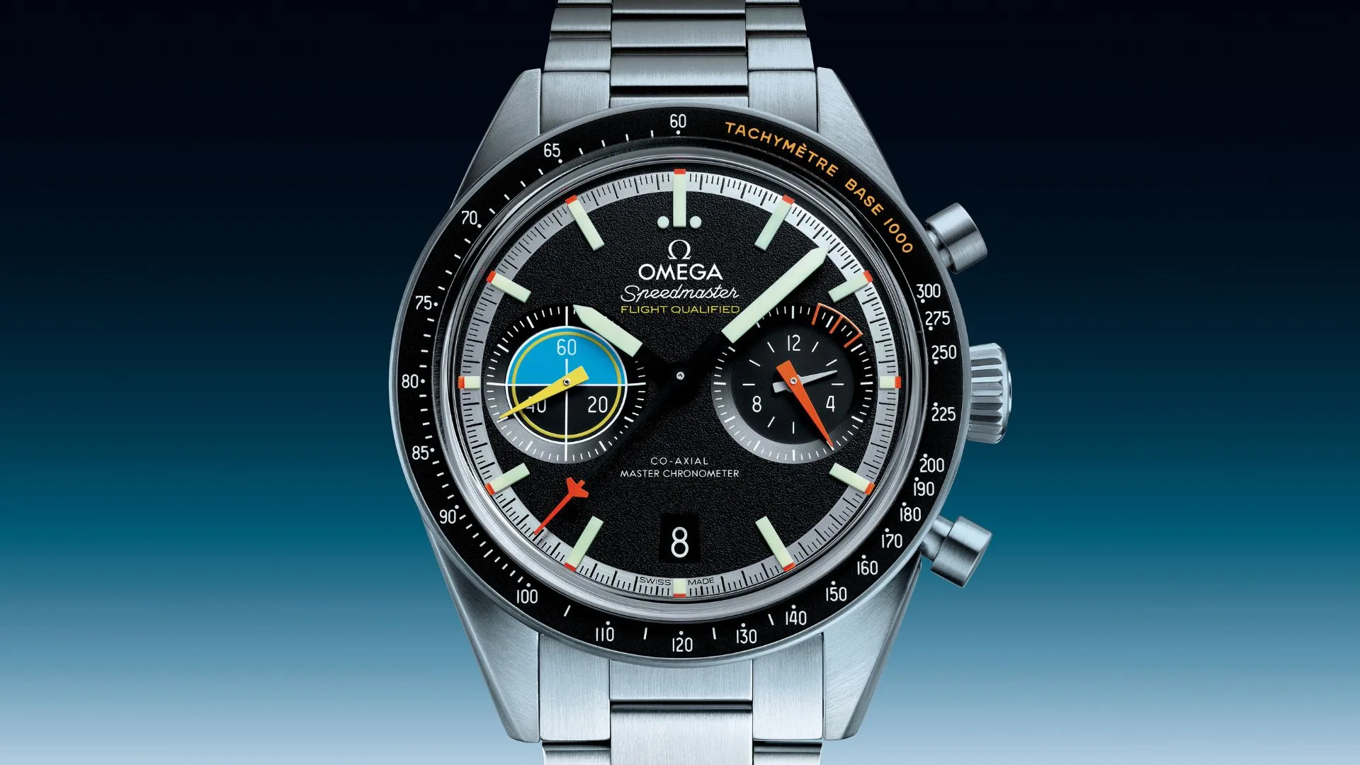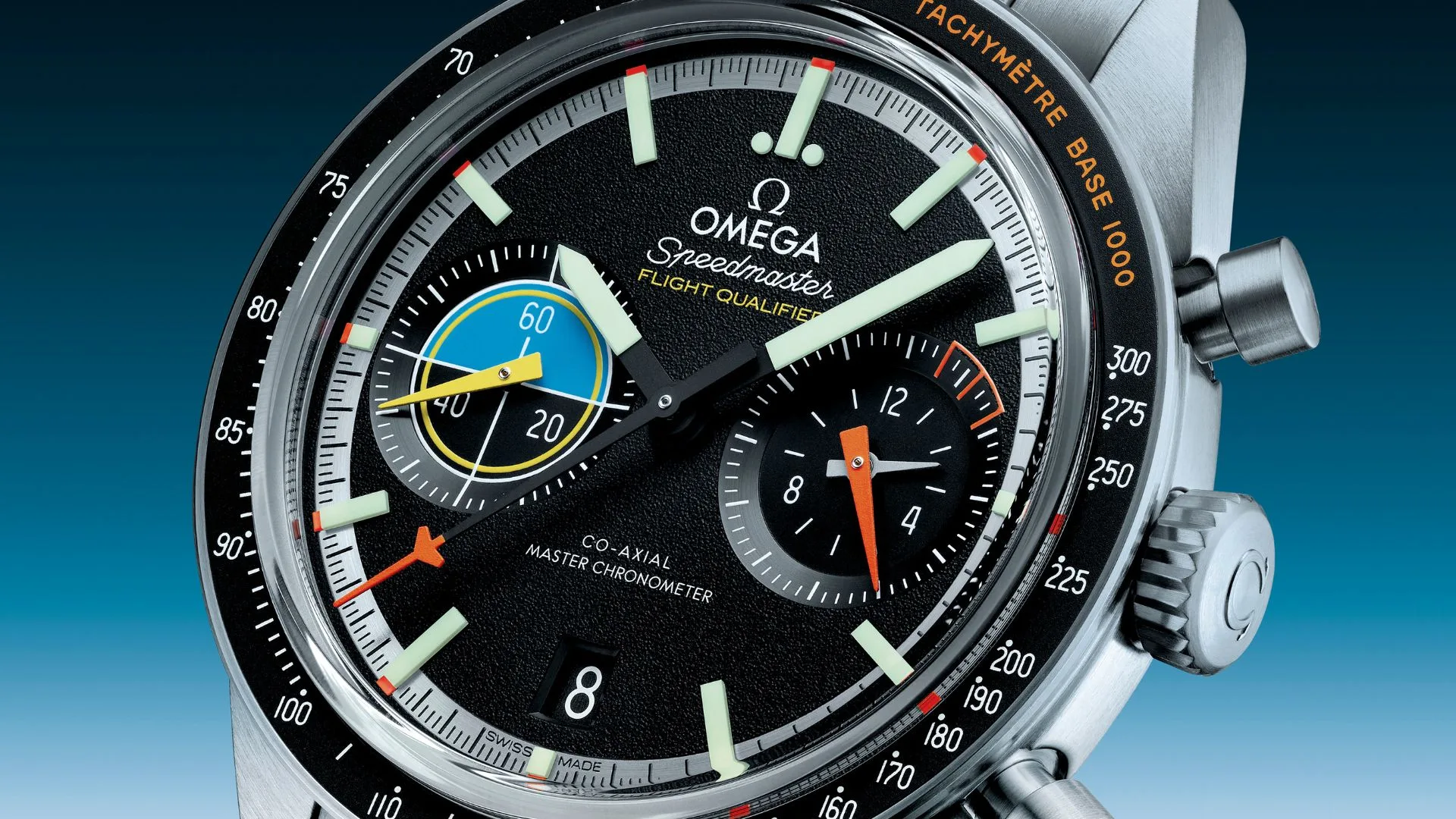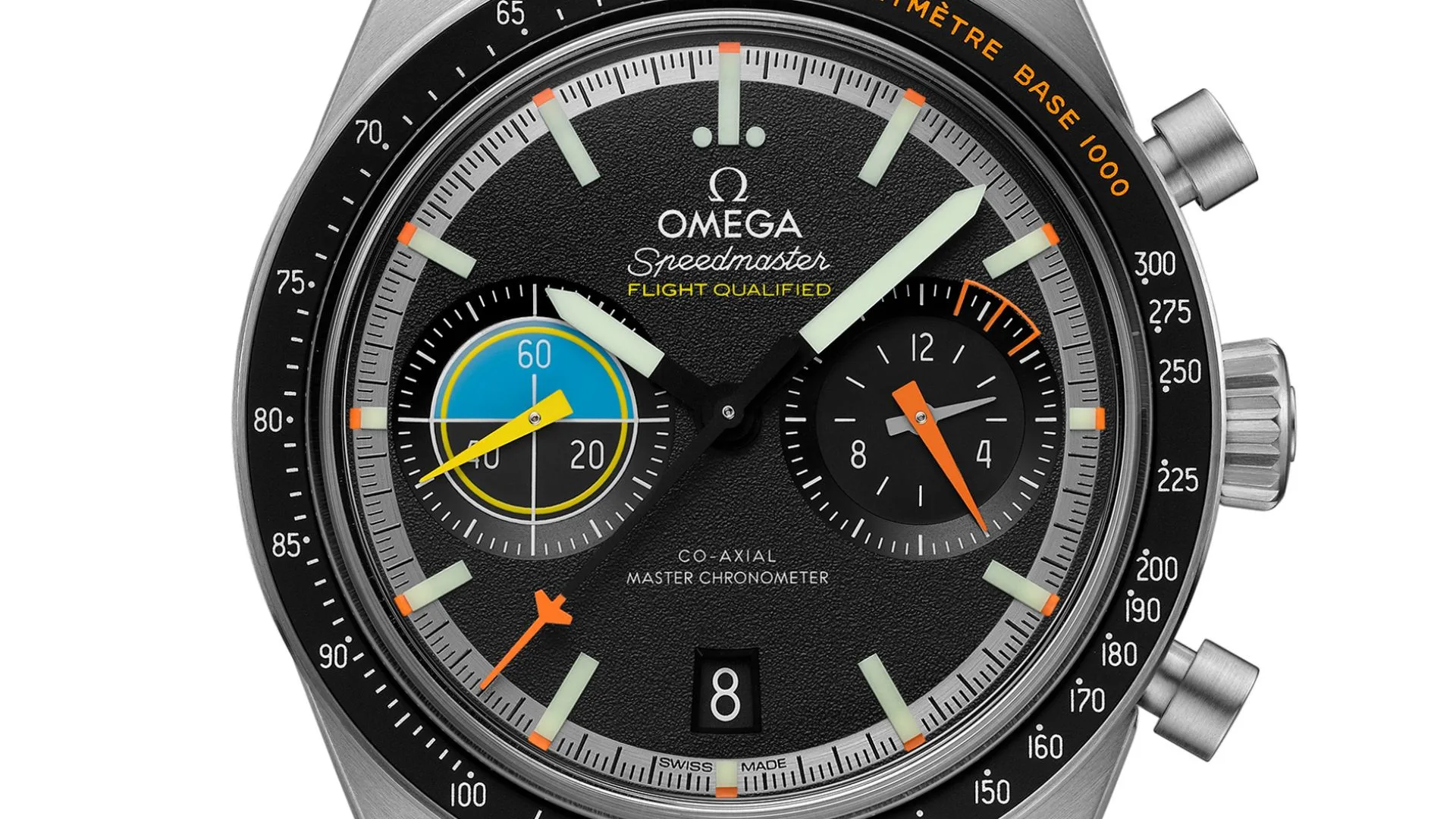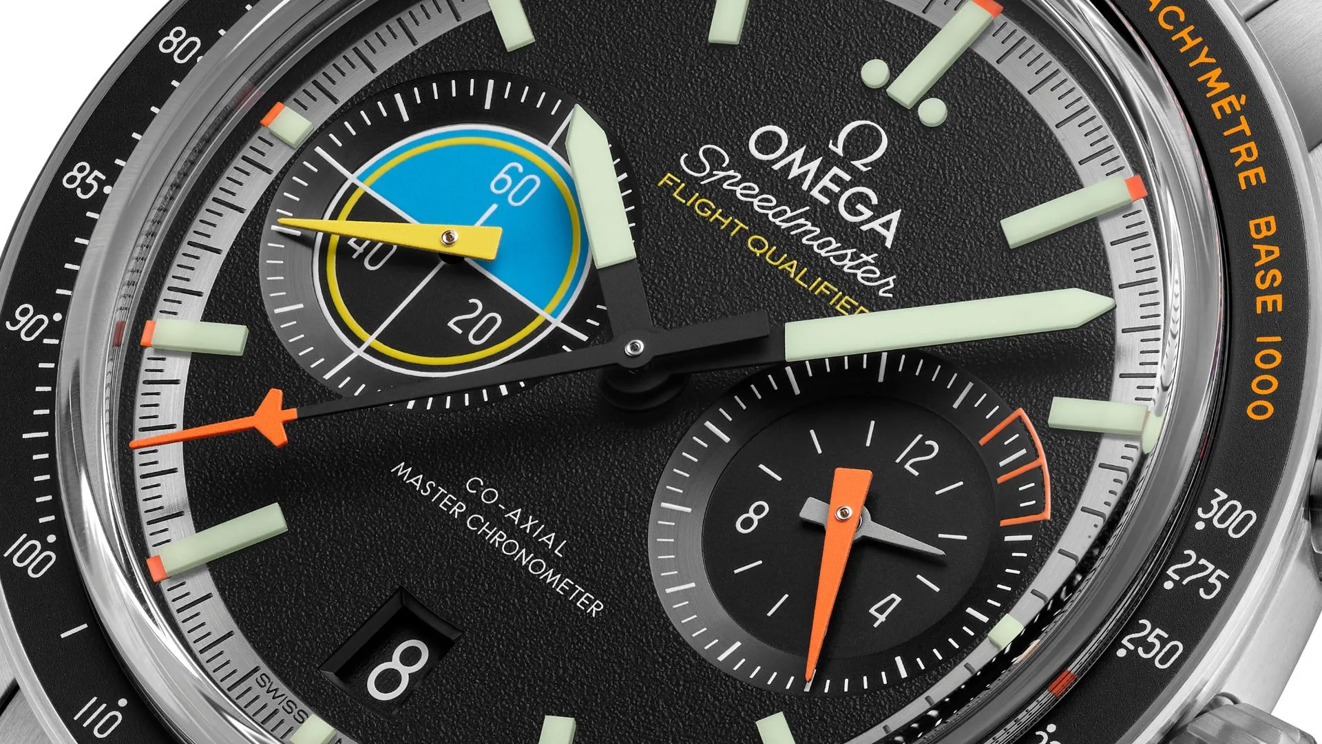 Perhaps most eye-catching of all are the twin subdials – both opaline at the centre and bevelled on the outside. At 3H, OMEGA has included a 60-minute and 12-hour recorder with a triangular matte-orange hand and transferred white numerals. The subdial is designed to look like the “burn rate” indicator in aircraft cockpits.