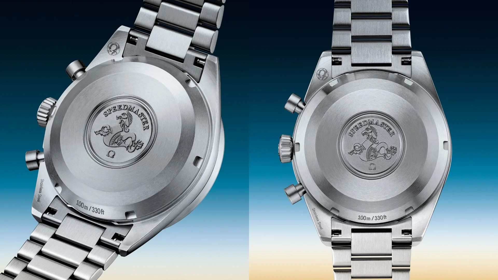 The symmetrical body of the new watch is crafted in stainless steel and features a matte finish to ensure it avoids light reflections. The bezel is mounted with a matte aluminium ring and retains its connection to Speedmaster heritage through a “Dot Over Ninety” and “Diagonal to Seventy” mark on the tachymeter scale.