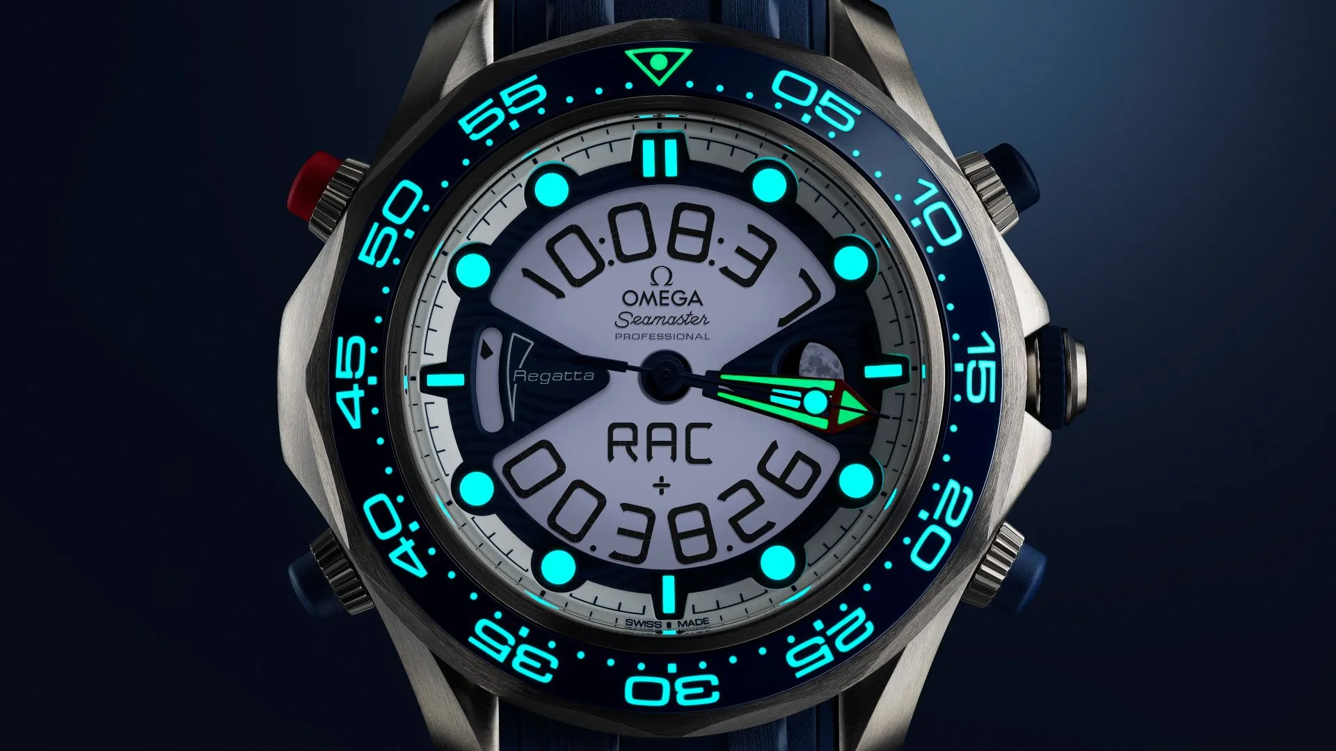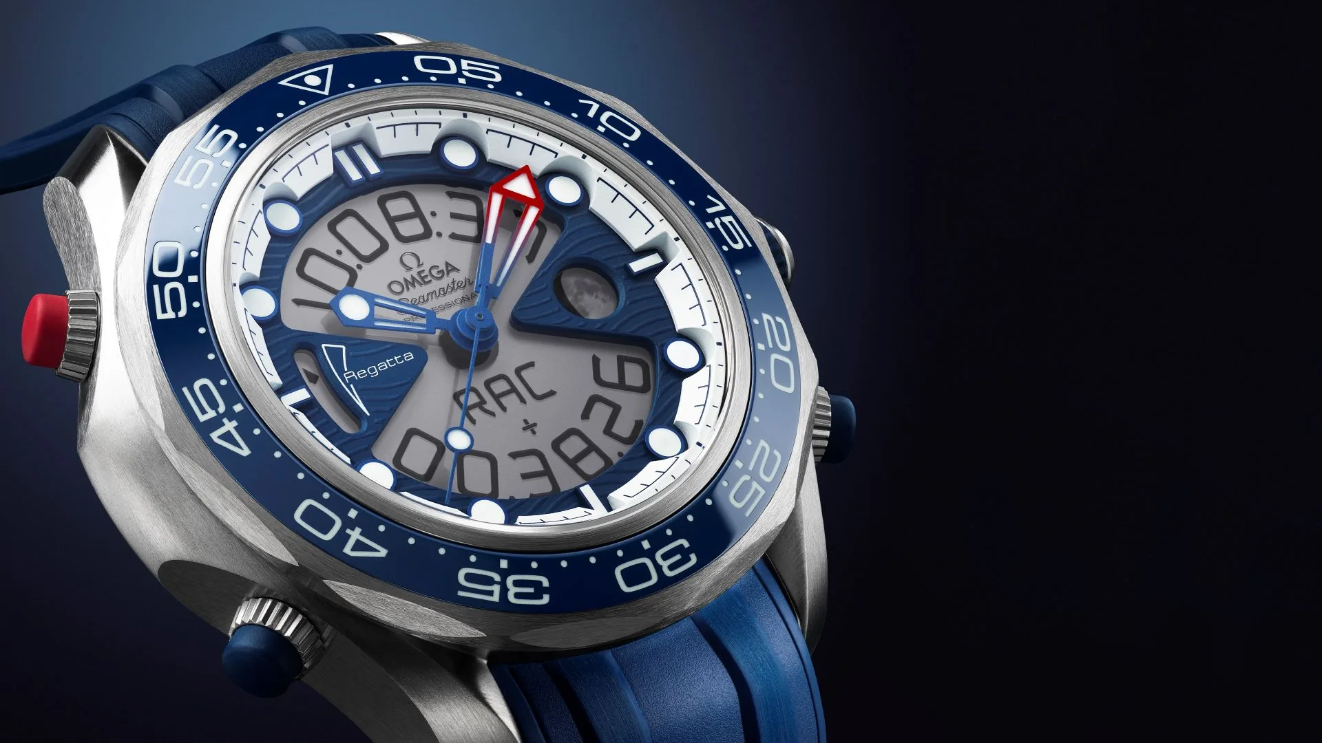 Reading a timepiece can be a challenge under sail, especially in turbulent seas, so OMEGA has ensured the Regatta can deliver data at-a-glance. The watch’s unique dial has an LCD display with black markings on a white-grey background to show its multiple digital readings, as well as Diver 300M- inspired hour, minute, and central seconds hand, which can be cleared from the display when in backlit mode to increase the legibility of the digital readouts.
