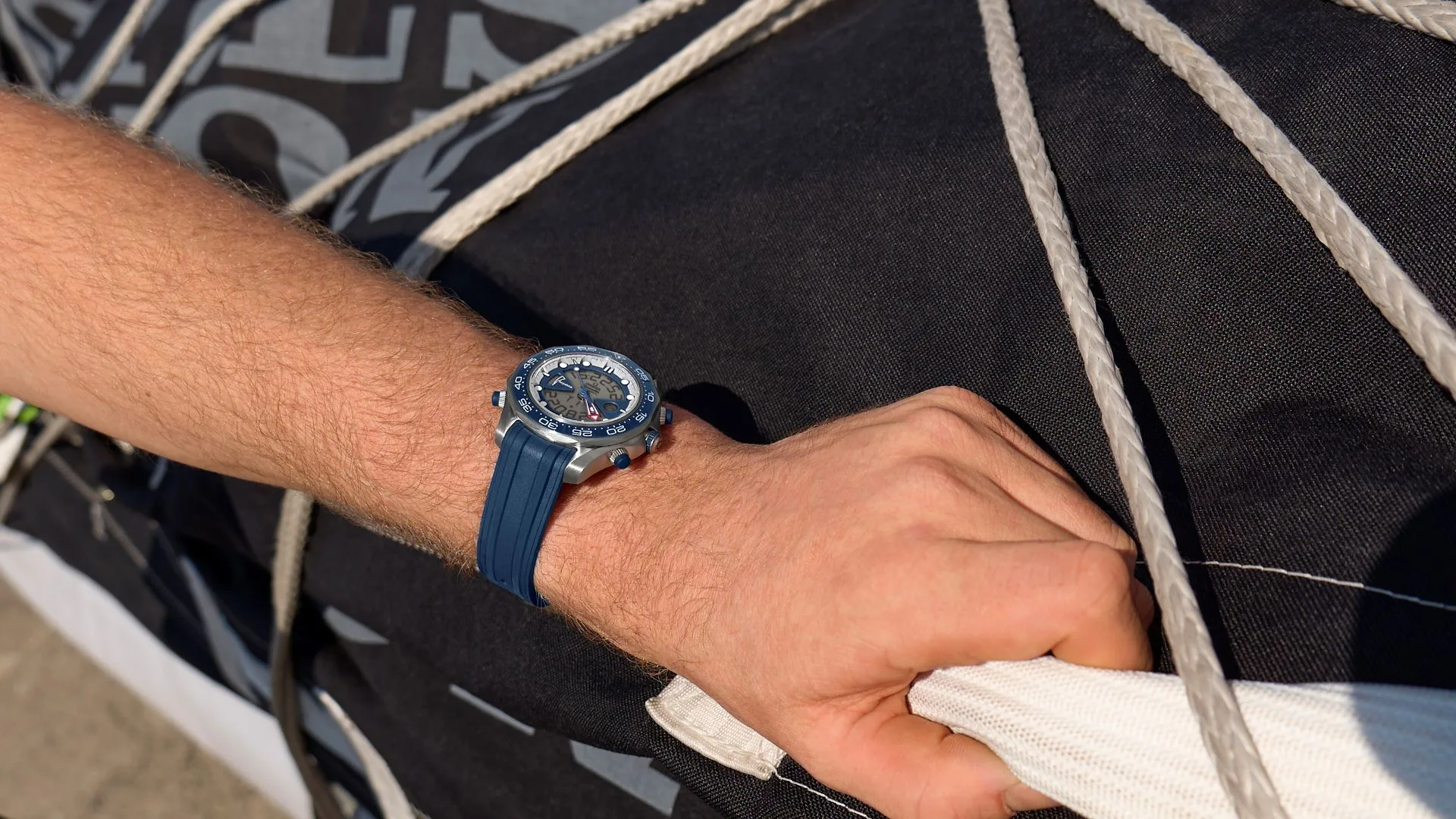 To complement the dial, pushers, and blue polished ceramic bezel ring, OMEGA’s ultimate instrument for sailors is presented on an integrated blue rubber strap fixed with OMEGA’s patented Quick-Change system.