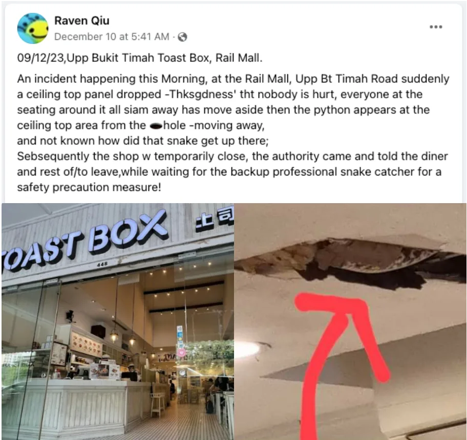 Thankfully, no customers were injured during the incident. A Toast Box spokesperson said that they’ve done repairs to the ceiling and the store reopened for business at 10:30am the same day. It was said that Rail Mall’s management has been made aware of the incident and has been working closely with the snake control team to ensure the safety and security of their customers and staff.