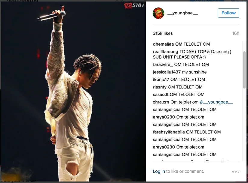 This morning, while stalking looking at BIGBANG member Taeyang’s Instagram, we noticed a slew of comments on one of his posts. When we say “slew”, we mean that a large number of the comments (out of over 13,000 comments) repeated the phrase, “Om Telolet Om”.