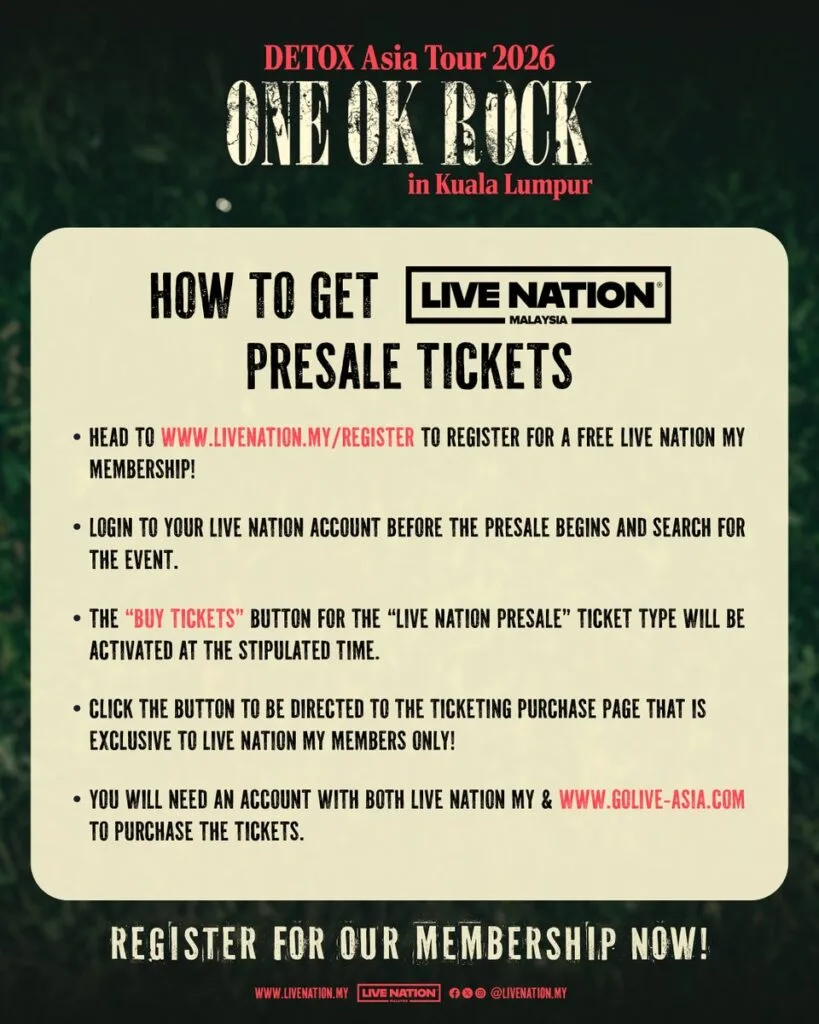 After announcing their upcoming concert in KL, Live Nation Malaysia has unveiled more details for ONE OK ROCK’s Detox Asia Tour in Malaysia! As previously shared, the band is set to perform at Axiata Arena on 29th April 2026 (Wednesday). Tickets will go on sale on 10th October 2025 (Friday), via Golive Asia, with Live Nation Presale available on 9th October 2025 (Thursday) from 11am to 11.59pm. Check out the full details below: