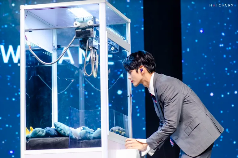 With the end of the song came the start of the next session; an interactive segment titled “I Will Catch A Star For You”. This included a session that tested Seong Wu’s skills with a claw machine, where he had to try his best to win plushies like one would in an arcade. Being ever the entertainer, he dramatically posed against the glass of the machine and said in a low voice, “I’ll catch it for you”, which sent the crowd into a frenzy.